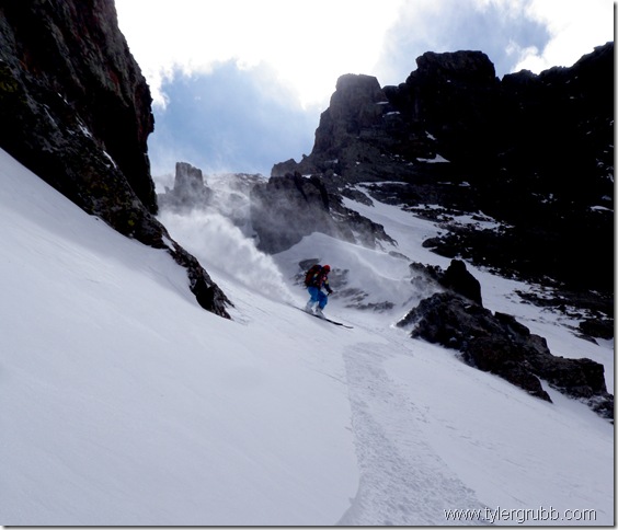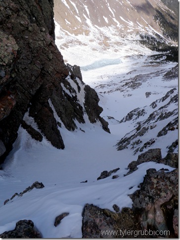 From the top of Broken Hand Pass, we descended west underneath the Needle towards Crestone Peak where we started up the Red Gully. By this point in the weekend, we had already climbed nearly 6,500 vertical feet and our legs were beginning to break down. The lack of water (after slipping out of my pack) and little sleep we got the night before weren’t helping either. After ascending a little more than half of Crestone Peak, we decided to call it a day and turn back. Our plan was just too ambitious. Without some wandering through deep snow in the basin the day before, or taking an unmarked route up Humboldt, we may have had the extra energy needed to succeed but it just wasn’t in the cards for this trip. After collecting some snow melt for water, we down-climbed a mixed section of the gully before strapping up and riding down to the basin floor.