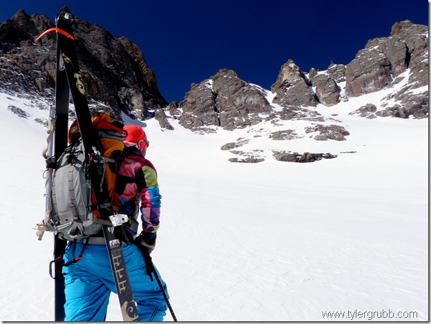 The snow here was solid and wind-blown to the point where turns weren’t made out of habit but more out of necessity. Chopping our way down wasn’t the highlight of the day, but we felt somewhat accomplished for making it this far. We packed up our gear at the bottom and hiked back over towards the pass. It seemed much less menacing on the way back as it did that morning. I think I knew in the back of my head that this couloir was waiting for us with good snow protected from the sun. We dropped into sheer bliss down the north slopes of the pass with powdery conditions.