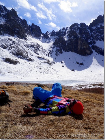 After setting up a tent and dropping most of our unnecessary gear, we set our sights on Humboldt Peak rising to the north. There was a snowfield running half the length to the summit so we packed our skis/board hoping to make it to the summit before nightfall. The slog of hauling our heavy packs all day was beginning to wear us down and our legs worked to get up the slope. After a few hours of slow climbing, we finally reached the summit with a little sunlight to spare. We carefully picked our route down in the alpenglow and got on the snowfield just as the sun had set behind the skyline. Some Italian sausages, bell peppers and onions were a welcome dinner at that point. We also had to boil some water from snow around camp to toss in our sleeping bags for the morning trek.